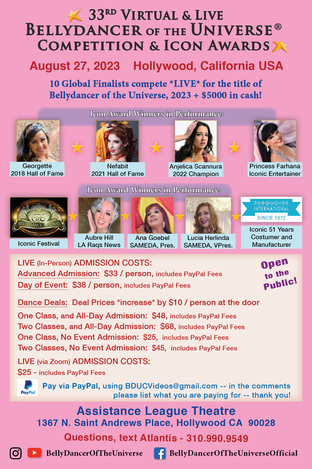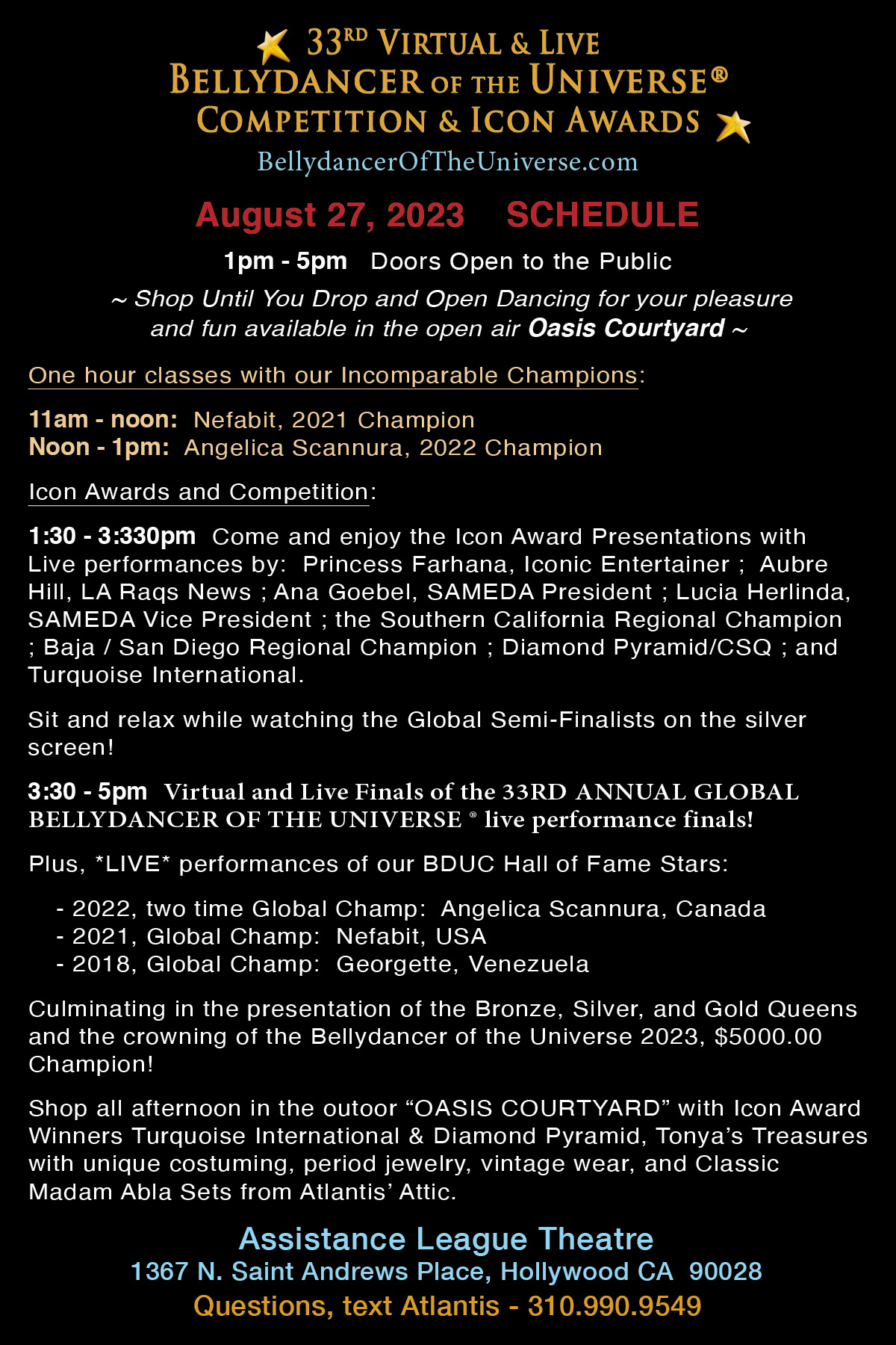 "Bellydance X-po™," "Belly Dance X-po™," "Global Bellydance X-po™," "Global Belly Dance X-po™, "Bellydance Xpo™," "Belly Dance Xpo™," "Global BellydanceXpo™," "Global Belly Dance Xpo™," "Bellydancer of the Universe®," "Belly Dancer of the Universe®," "Bellydance Universe®," "Belly Dance Universe®," and "BDUC" are trademarks of A. Long and the Bellydancer of the Universe® Competitions. Bellydancer of the Universe® intellectual property is protected by Federal Trademark.