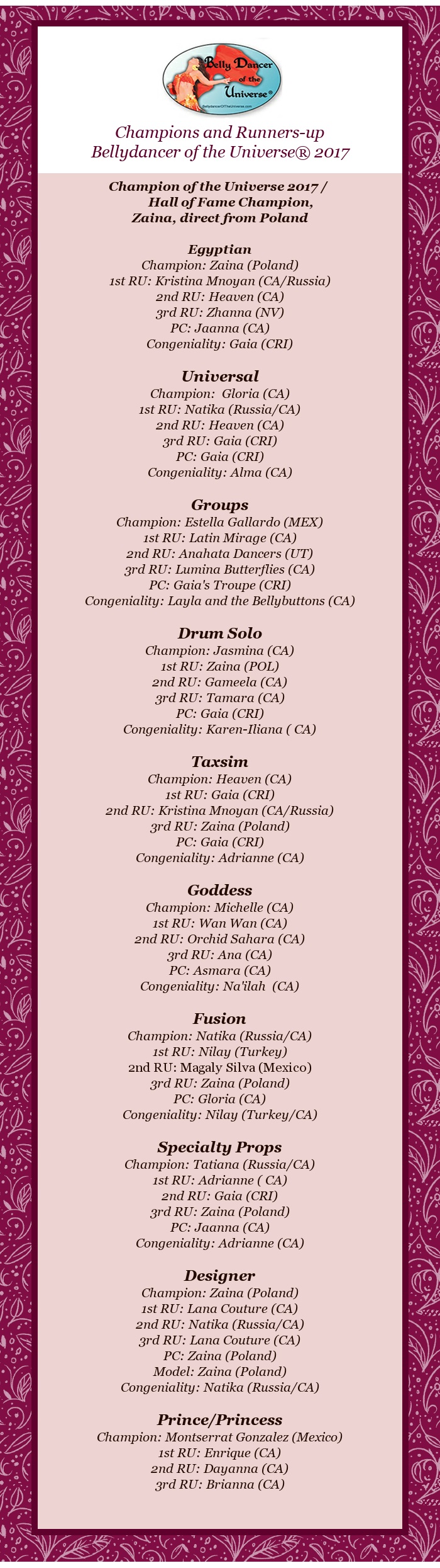We thank you all for competing at Bellydancer of the Universe® Competition, 2017. You are all stars of the universe. We hope to see you next year in Orange County at the Orange County Business Expo Center, 15 minutes from Disneyland and the Orange County airport.
