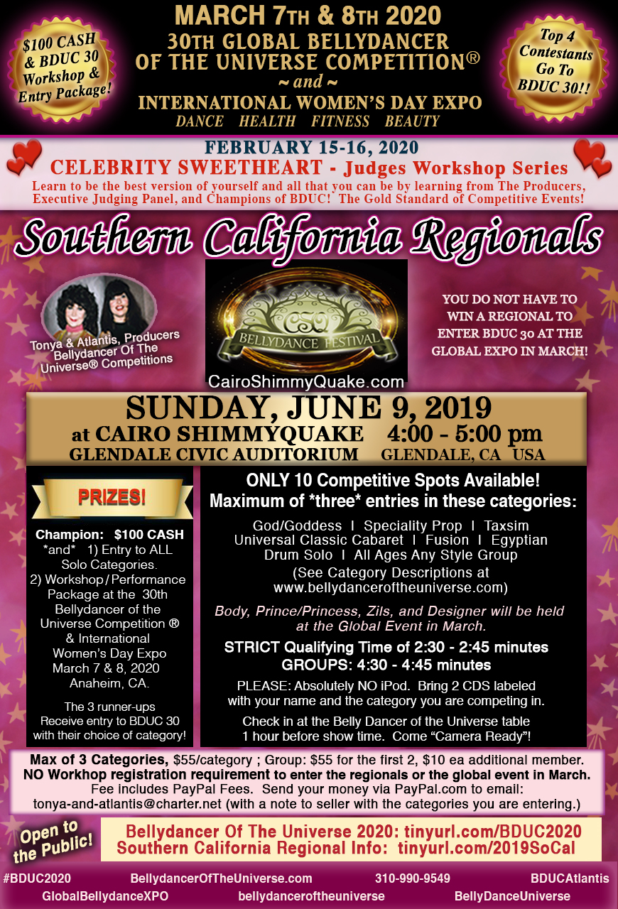"Bellydance X-po™," "Belly Dance X-po™," "Global Bellydance X-po™," "Global Belly Dance X-po™, "Bellydance Xpo™," "Belly Dance Xpo™," "Global BellydanceXpo™," "Global Belly Dance Xpo™," "Bellydancer of the Universe®," "Belly Dancer of the Universe®," "Bellydance Universe®," "Belly Dance Universe®," and "BDUC" are trademarks of A. Long and the Bellydancer of the Universe® Competitions. Bellydancer of the Universe® intellectual property is protected by Federal Trademark.